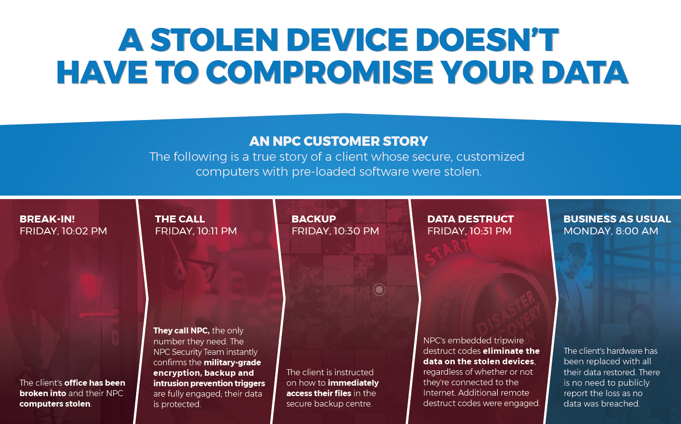 A stolen device doesn't need to endanger your business or cause you expensive downtime. With NPC's secured managed computers, our customers have the assurance of knowing their sensitive data is backed-up and protected. See how quickly NPC responds in the event of a stolen device.