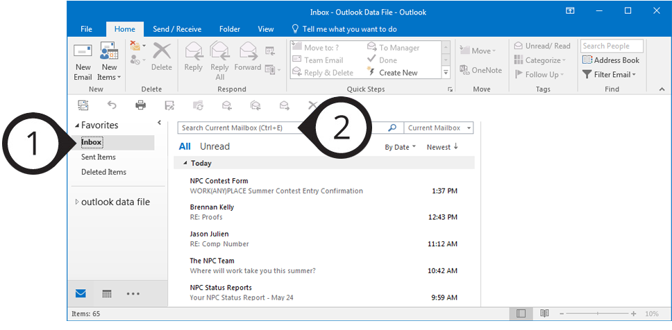 - Use the Search Inbox field to type in your search terms. Press Enter and the search results will load shortly. Note: Your ribbon will also automatically change to the Search Tools tab.