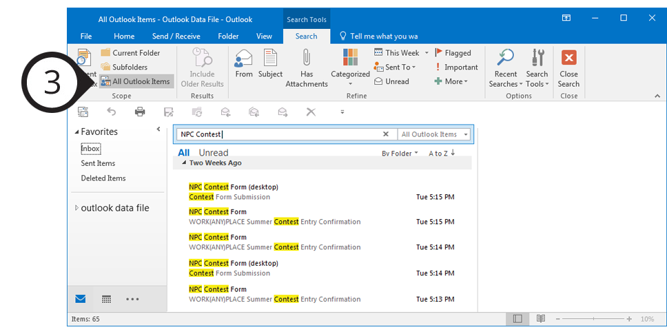 - If you want to search your entire Outlook, click on the All Outlook Items button, at the top left corner of the window under the Search Tools tab.